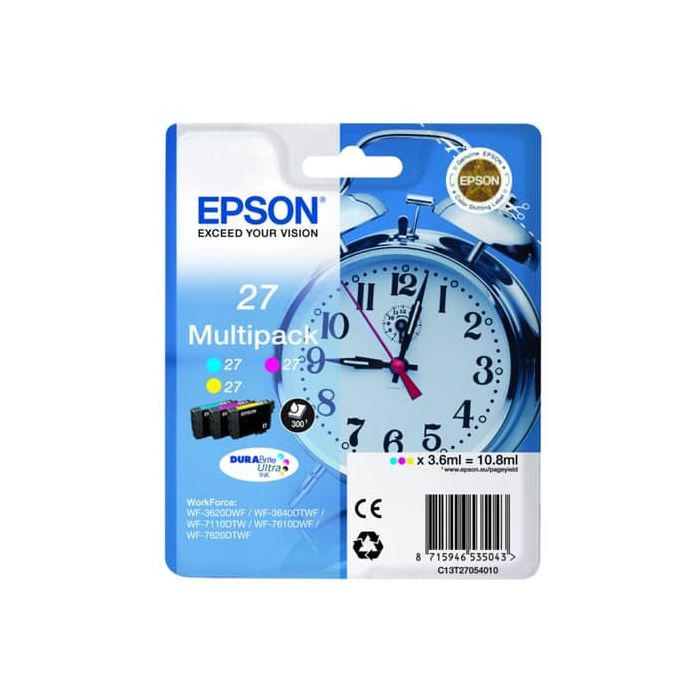 Epson 27 MultiPack, 3-pack, 10.8 ml. Colori : giallo, ciano e magenta - original. Tecnologia di stampa: Ink-jet. Compatibile con WorkForce WF-3620, WF-3640, WF-7110, WF-7210, WF-7610, WF-7620, WF-7710, WF-7715, WF-7720. Contenuto: 1 x cartuccia d'inchiostro (ciano) 3. 6 ml, fino a 300 pagine - 1 x cartuccia d'inchiostro (magenta) 3. 6 ml, fino a 300 pagine - 1 x cartuccia d'inchiostro (giallo) 3. 6 ml, fino a 300 pagine.