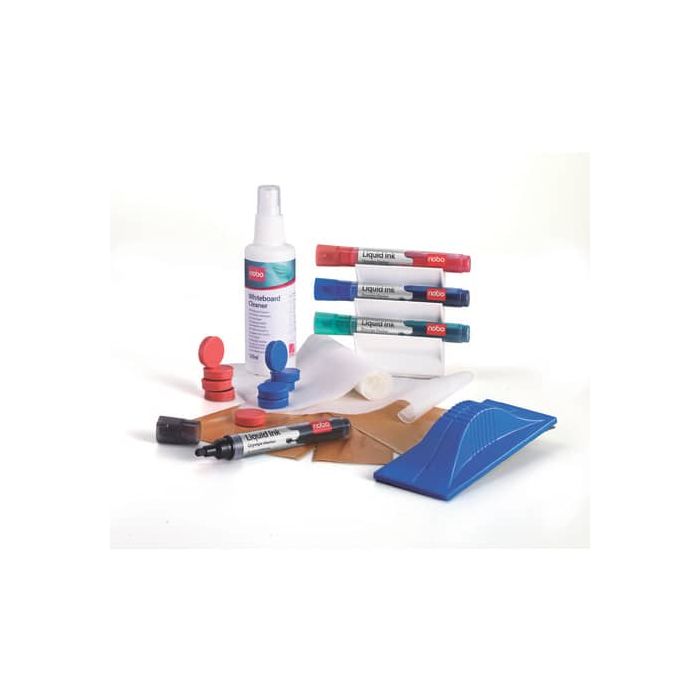 Il kit Nobo per lavagne bianche ha tutti gli accessori di cui hai bisogno per completare la tua lavagna bianca Nobo. Comprende 4 pennarelli cancellabili a secco, un supporto magnetico per pennarello, un cancellino magnetico, 5 ricariche per il cancellino, uno spray per la pulizia da 125 ml con panni e 10 magneti da 10 mm x 25 mm.