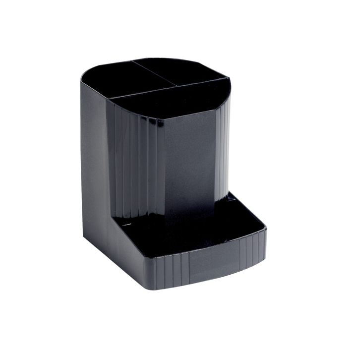 Porta penne MINI-OCTO Ecoblack Certificato Blue Angel perché realizzato utilizzando bottiglie di succo d'arancia riciclate. Portapenne compatto e moderno, ideale per gli accessori di cancelleria più comuni. Scomparto per piccoli accessori come graffette, spilli, o per appoggiare il cellulare. 3 scomparti di dimensioni ed altezze diverse per adattarsi ad ogni tipo di oggetto.
